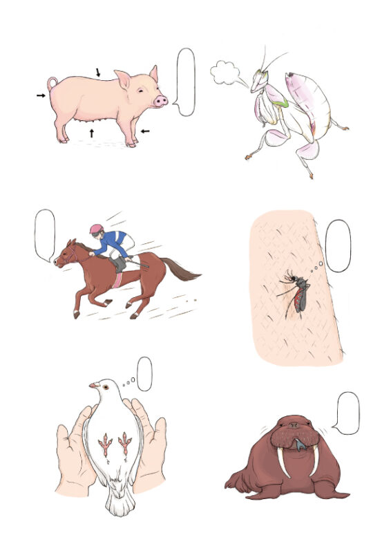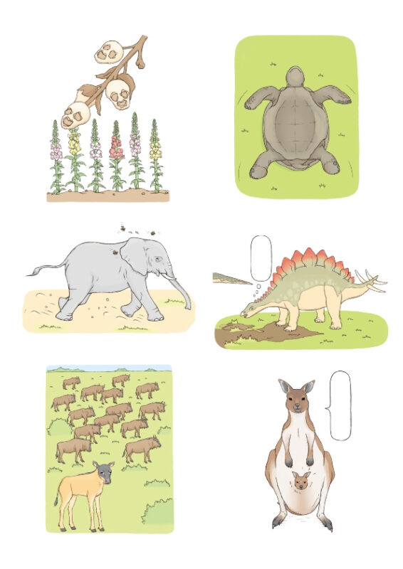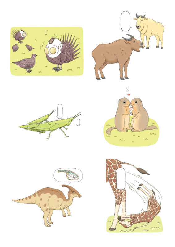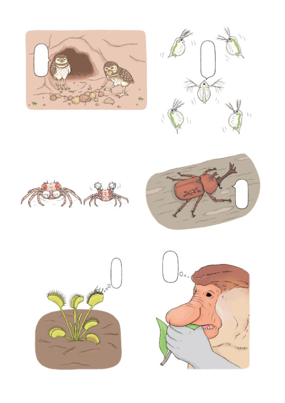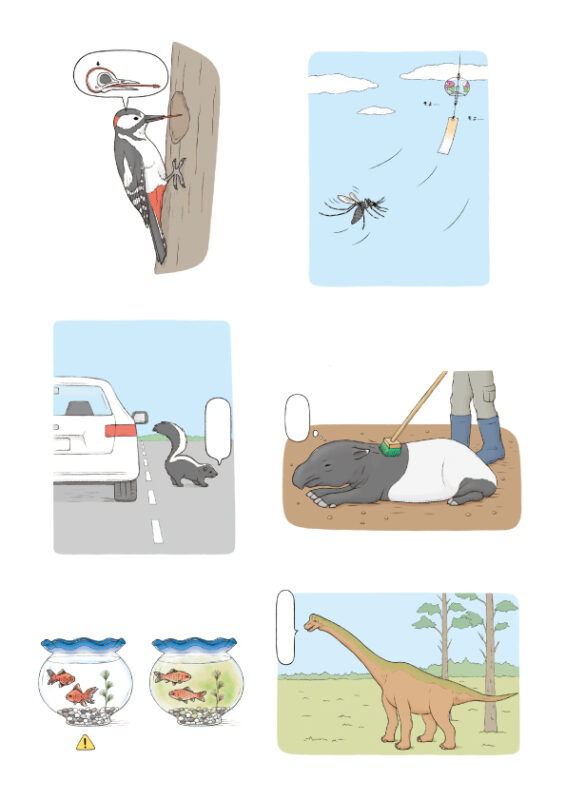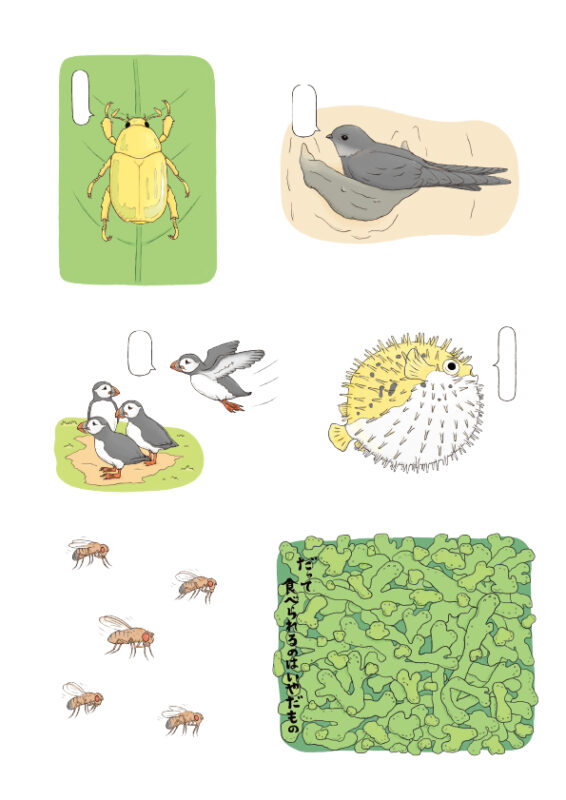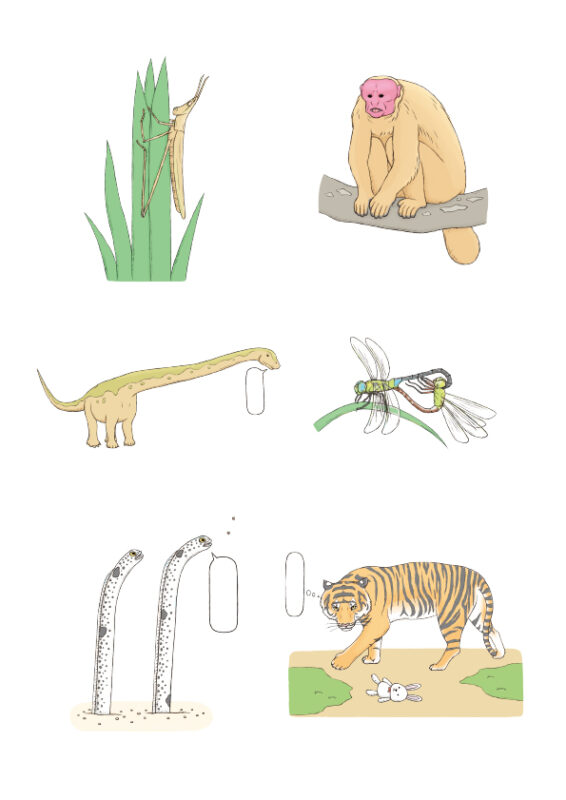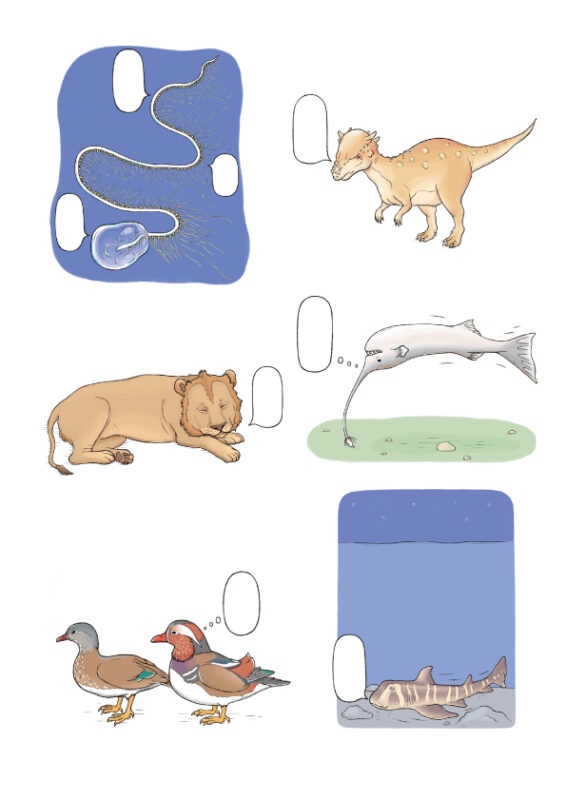 おもしろい!進化のふしぎ やっぱりざんねんないきもの事典 カバーイラスト ページ抜粋