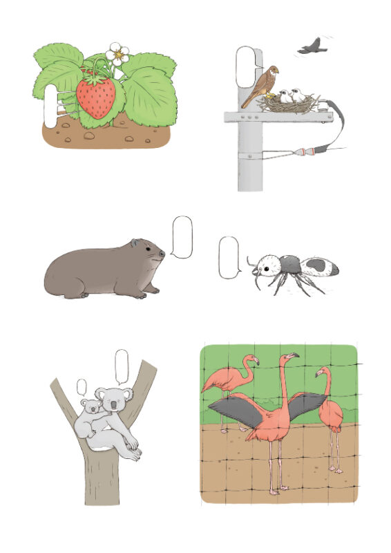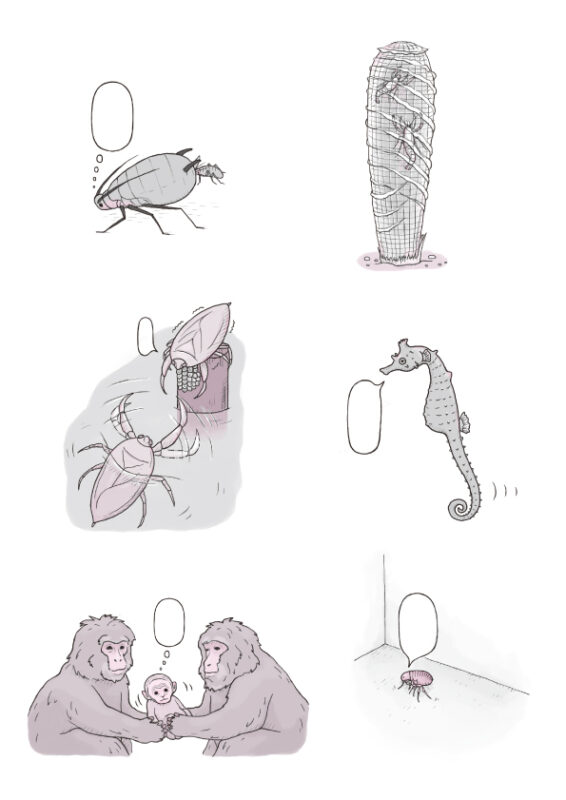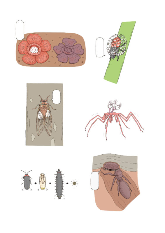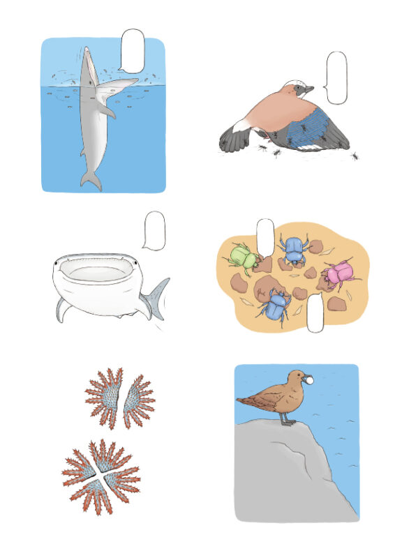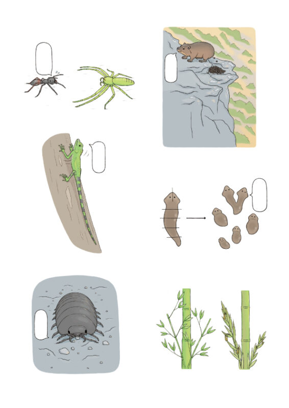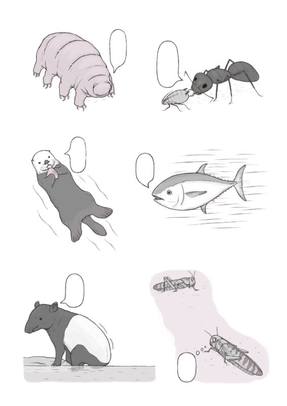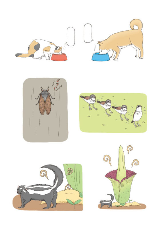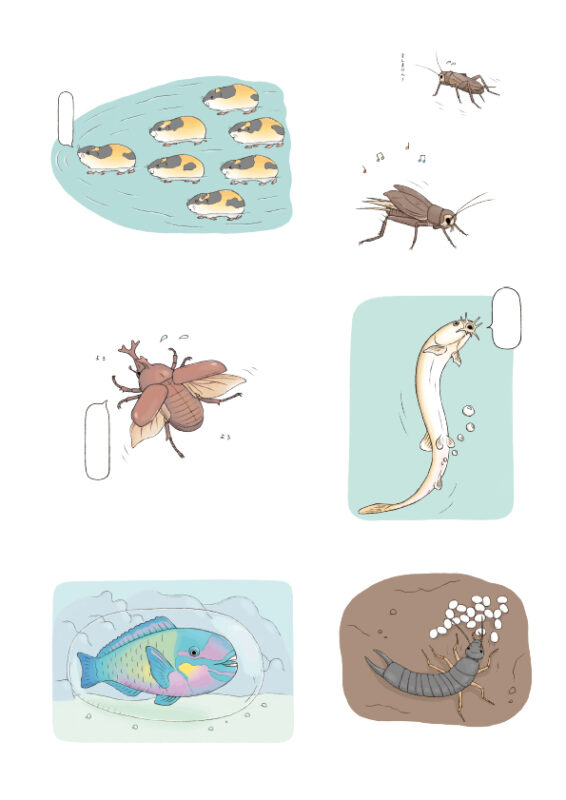 おもしろい!進化のふしぎ やっぱりざんねんないきもの事典 カバーイラスト ページ抜粋
