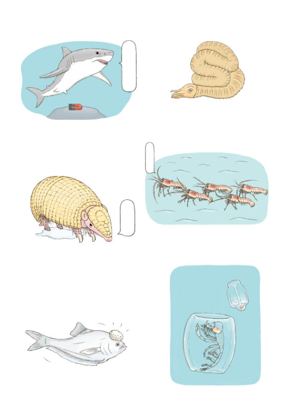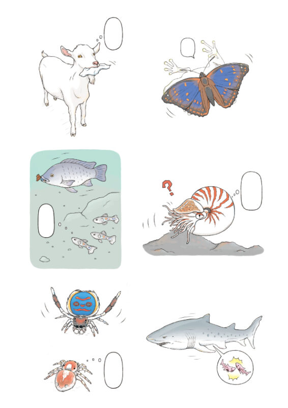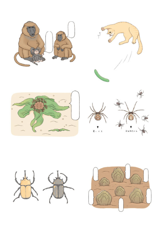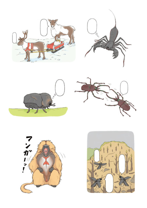 おもしろい!進化のふしぎ まだまだざんねんないきもの事典 カバーイラスト ページ抜粋